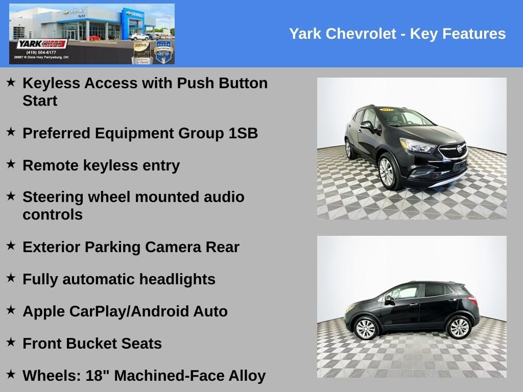 Certified. 2017 Ebony Twilight Metallic Buick Encore Preferred ECOTEC 1.4L I4 SMPI DOHC Turbocharged VVT Keyless Access with Push Button Start, Apple CarPlay/Android Auto, Exterior Parking Camera Rear, Front Bucket Seats, Fully automatic headlights, Preferred Equipment Group 1SB, Remote keyless entry, Steering wheel mounted audio controls, Wheels: 18 Machined-Face Alloy.Clean CARFAX. Odometer is 45538 miles below market average! 25/33 City/Highway MPGCertification Program Details: This vehicle is part of GMâs CarBravo® program meaning you get certified inspection and reconditioning, a standard GM-backed limited warranty, roadside assistance, and access to the nationwide GM service network. Choose with confidence. Ask us about full CarBravo benefits. ? Comprehensive Multi-Point Inspection & Reconditioning Every CarBravo vehicle meets GM standards for quality and reliability. ? GM-Backed Limited Warranty Includes a 6-month/6,000-mile bumper-to-bumper limited warranty (or 30-day/1,000-mile for BravoBudget vehicles). ? Roadside Assistance & Courtesy Transportation Coverage during the warranty period for added confidence. ? Vehicle Exchange Program If itâs not the right fit, exchange it within 10 days or 500 miles. ? Transparent Vehicle History Every CarBravo vehicle includes a free vehicle history report and clear, upfront pricing. ? Nationwide GM Service Network Access professional service and warranty support at thousands of GM dealerships. ? Complimentary Trials Eligible vehicles include a 1-month OnStar® trial and 3-month SiriusXM® subscription. Buy with confidence this CarBravo® vehicle from Yark Automotive Group includes a GM-backed limited warranty, multi-point inspection, roadside assistance, and vehicle exchange program. ? Certified quality. ? Transparent pricing. ? Nationwide GM service support. CarBravo by Yark Certified. Backed by GM. Driven by You.Shop Smarter with Yark Automotive! Yark makes car buying easy with Live Market Pricing updated hourly from over 20,000 sites to ensure you get a real-time, fair market price on every pre-owned vehicle. No games, no inflated prices just transparent, competitive value from a dealership trusted for 40+ years. With 12 brands and 8 convenient locations across NW Ohio & SE Michigan, Yark offers the largest new and used inventory in the region making it easy to find exactly what youâre looking for! Buy with confidence from the regionâs #1 volume new & used automotive group for 28+ years!