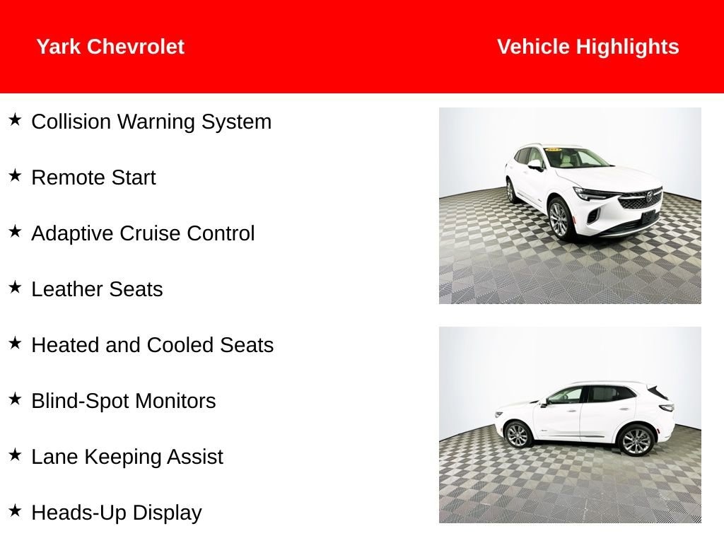 Certified. 2022 Summit White Buick Envision Avenir 2.0L Turbocharged Collision Warning System, Remote Start, Adaptive Cruise Control, Leather Seats, Heated and Cooled Seats, Blind-Spot Monitors, Lane Keeping Assist, Heads-Up Display, Keyless Access with Push Button Start, Sunroof / Moonroof, Bose Premium Audio Package, Memory Seat Package, Power Programmable Liftgate, AWD, Adaptive Cruise Control, Automatic temperature control, Bose Premium 9-Speaker Audio System Feature, Enhanced Automatic Emergency Braking, Enhanced Automatic Parking Assist, Enhanced LED Functionality Headlamps, Front & Rear Park Assist, HD Surround Vision, Heads-Up Display, Heated Front Seats, Heated Rear Seats, Heated Steering Wheel, Lane Change Alert w/Side Blind Zone Alert, Memory seat, Navigation System, Power Liftgate, Power Panoramic Tilt-Sliding Moonroof, Preferred Equipment Group 1SU, Rear Camera Mirror, Rear Camera Mirror Washer, Rear Cross Traffic Alert, Remote keyless entry, Safety Package, Technology Package I, Technology Package II, Ventilated front seats, Wheels: 20 Aluminum w/Avenir Pearl Nickel Finish, Wireless Apple CarPlay/Wireless Android Auto.