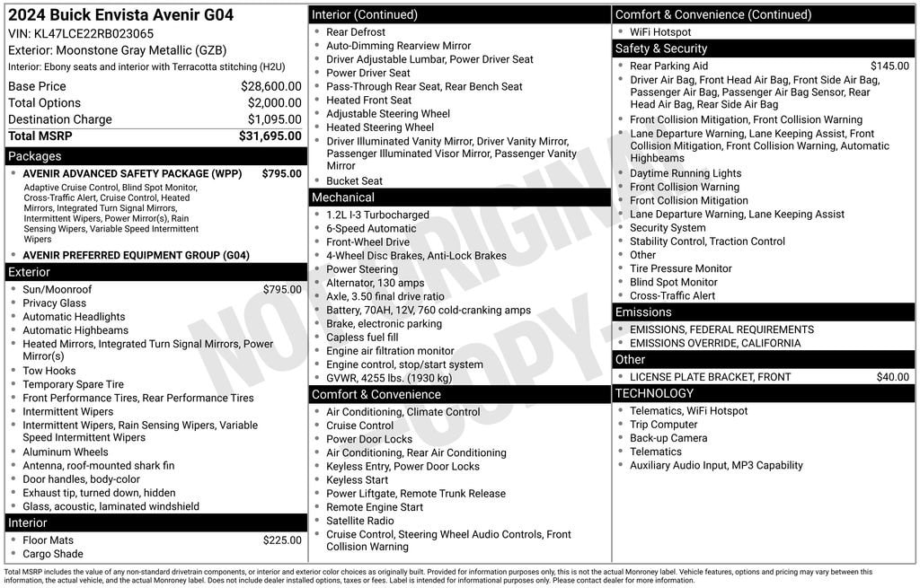 Certified. Recent Arrival! 2024 Moonstone Gray Metallic Buick Envista Avenir ECOTEC 1.2L Turbo Collision Warning System, Remote Start, Adaptive Cruise Control, Leather Seats, Heated Seats, Blind-Spot Monitors, Lane Keeping Assist, Keyless Access with Push Button Start, Sunroof / Moonroof, *New Tires*, Power Programmable Liftgate, Adaptive Cruise Control, Automatic temperature control, Avenir Advanced Safety Package, Exterior Parking Camera Rear, Front Intermittent Rainsense Wipers, Heated Front Seats, Heated steering wheel, Lane Change Alert w/Side Blind Zone Alert, Perforated Leather-Appointed Seat Trim, Power driver seat, Power Liftgate, Power Tilt-Sliding Moonroof w/Manual Sunshade, Preferred Equipment Group G04, Premium 6-Speaker Audio System Feature, Rear Cross Traffic Alert, Rear Park Assist, Remote keyless entry, Steering wheel mounted audio controls, Wheels: 19 Avenir Premium Pearl Nickel Aluminum, Wireless Apple CarPlay/Wireless Android Auto.
