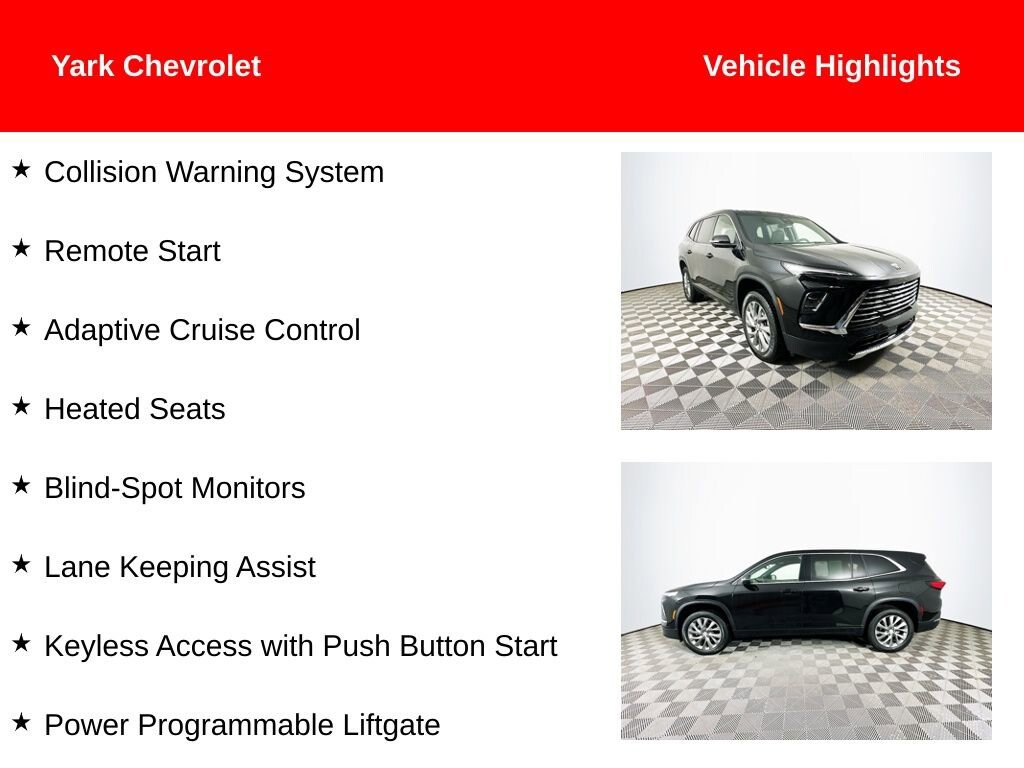Certified. Recent Arrival! 2025 Ebony Twilight Metallic Buick Enclave Preferred 2.5L DOHC Collision Warning System, Remote Start, Adaptive Cruise Control, Heated Seats, Blind-Spot Monitors, Lane Keeping Assist, Keyless Access with Push Button Start, Power Programmable Liftgate, 3rd row seats: split-bench, Automatic temperature control, Bose Premium 12-Speaker Audio System, Heated front seats, Heated steering wheel, Leatherette Seat Trim, Navigation System, Power Liftgate, Preferred Equipment Group 1SD, Remote keyless entry, Wheels: 20 Alloy with Medium Android Finish, Wireless Apple CarPlay, Wireless Google Android Auto.