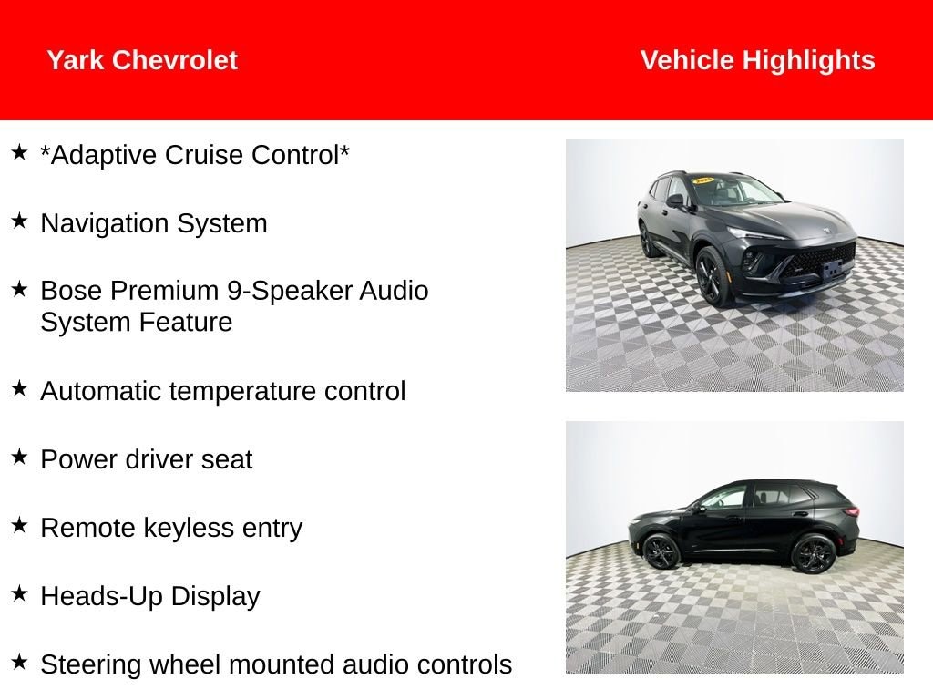 Certified. 2025 Ebony Twilight Metallic Buick Envision Sport Touring 2.0L Turbocharged *Adaptive Cruise Control*, Automatic temperature control, Bose Premium 9-Speaker Audio System Feature, Exterior Parking Camera Rear, Fully automatic headlights, Heads-Up Display, Navigation System, Power driver seat, Power Liftgate, Remote keyless entry, Steering wheel mounted audio controls, Wireless Apple CarPlay/Wireless Android Auto.