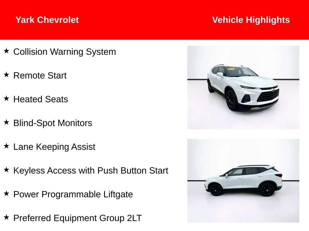 Certified. 2022 Summit White Chevrolet Blazer LT 2.0L Turbocharged Collision Warning System, Remote Start, Heated Seats, Blind-Spot Monitors, Lane Keeping Assist, Keyless Access with Push Button Start, Power Programmable Liftgate, AWD, Apple CarPlay/Android Auto, Automatic temperature control, Convenience & Driver Confidence Package, Exterior Parking Camera Rear, Fully automatic headlights, Heated Front Seats, Lane Change Alert w/Side Blind Zone Alert, Preferred Equipment Group 2LT, Premium Cloth Seat Trim, Rear Cross Traffic Alert, Rear Park Assist w/Audible Warning, Rear Power Programmable Liftgate, Remote keyless entry, Remote Start, Universal Home Remote, Wheels: 18 Bright Silver Aluminum.