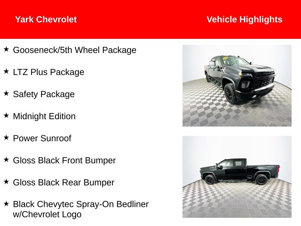 Certified. 2022 Black Chevrolet Silverado 2500HD LTZ Duramax 6.6L V8 Turbodiesel 4 Round Black Assist Steps (LPO), Bed View Camera w/2 Trailer Camera Provisions, Black Beltline Moldings, Black Chevytec Spray-On Bedliner w/Chevrolet Logo, Gloss Black Front Bumper, Gloss Black Rear Bumper, Gooseneck/5th Wheel Package, HD Rear Vision Camera, Heated Front Seats, Heated Steering Wheel, High Gloss Black Door Handles, High Gloss Black Mirror Caps, Integrated Trailer Brake Controller, Lane Change Alert w/Side Blind Zone Alert, LTZ Plus Package, Midnight Edition, Multi-Flex Tailgate, Power Sunroof, Safety Package, Ventilated Driver & Front Passenger Seats, Wheels: 18 High Gloss Black Aluminum.