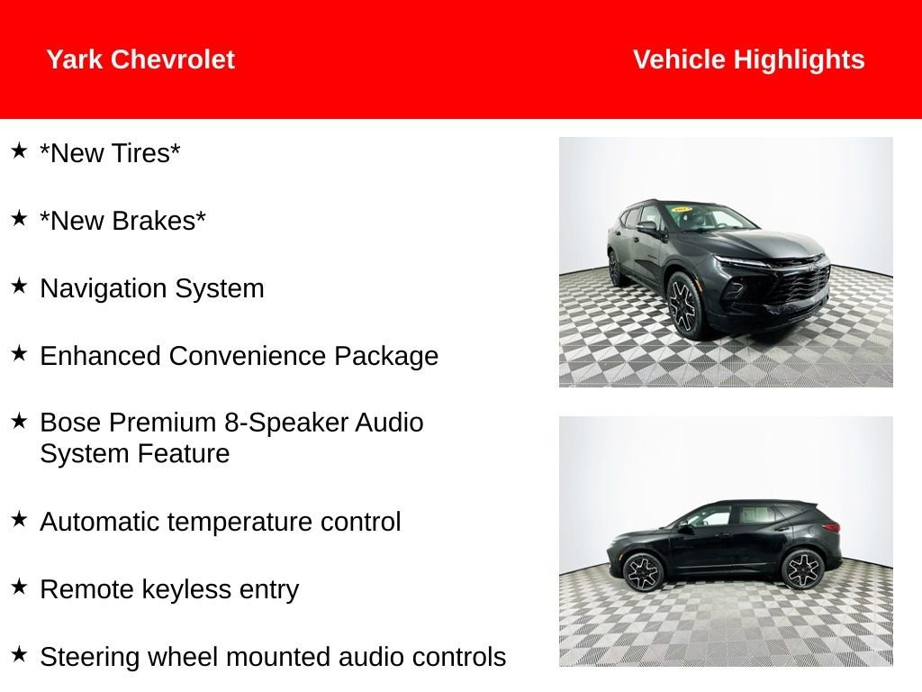 Certified. Recent Arrival! 2023 Black Chevrolet Blazer RS 3.6L V6 SIDI *New Tires*, *New Brakes*, AWD, Apple CarPlay/Android Auto, Automatic temperature control, Bose Premium 8-Speaker Audio System Feature, Enhanced Convenience Package, Fully automatic headlights, Heated Rear Seats, Heated Steering Wheel, Memory Settings For Driver Seat & Exterior Mirrors, Navigation System, Power driver seat, Power Liftgate, Power Panoramic Tilt-Sliding Sunroof, Power Tilt & Telescoping Steering Column, Remote keyless entry, Steering wheel mounted audio controls, Ventilated Driver & Front Passenger Seats, Wheels: 21 High Gloss Black w/Machined Face.