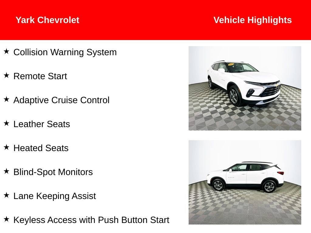 Certified. 2023 Summit White Chevrolet Blazer LT 2.0L Turbocharged Collision Warning System, Remote Start, Adaptive Cruise Control, Leather Seats, Heated Seats, Blind-Spot Monitors, Lane Keeping Assist, Keyless Access with Push Button Start, Bose Premium Audio Package, Power Programmable Liftgate, Adaptive Cruise Control, Apple CarPlay/Android Auto, Automatic temperature control, Bose Premium 8-Speaker Audio System Feature, Driver Confidence Package, Enhanced Automatic Emergency Braking, HD Surround Vision, Heated Front Seats, Lane Change Alert w/Side Blind Zone Alert, Perforated Leather-Appointed Seat Trim, Power Liftgate, Power Panoramic Tilt-Sliding Sunroof, Preferred Equipment Group 3LT, Rear Camera Mirror, Rear Cross Traffic Alert, Rear Park Assist w/Audible Warning, Rear Power Programmable Liftgate, Remote keyless entry, Sound & Technology Package, Universal Home Remote, Wheels: 18 Grazen Metallic Aluminum, Wireless Charging.