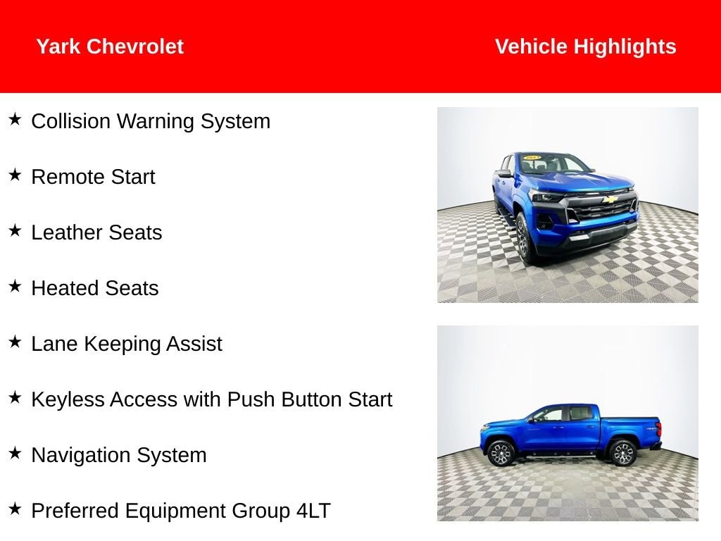 Certified. 2023 Glacier Blue Metallic Chevrolet Colorado LT 2.7L Turbo Collision Warning System, Remote Start, Leather Seats, Heated Seats, Lane Keeping Assist, Keyless Access with Push Button Start, 4WD, Apple CarPlay/Android Auto, Blind Zone Steering Assist, Chevy Safety Assist, Dual Rear USB Ports (Charge Only), Dual-Zone Automatic Air Conditioning, Electronic Automatic Cruise Control, Evotex Seat Trim, EZ-Lift & Lower Tailgate, Heated Front Seats, Heated Steering Wheel, Lane Keep Assist w/Lane Departure Warning, LED Daytime Running Lamps, LED Headlamps, LT Convenience Package, LT Convenience Package II, LT Convenience Package III, Navigation System, Preferred Equipment Group 4LT, Rear Cross Traffic Braking, Rear Park Assist, Remote keyless entry, Safety Package, StowFlex Tailgate Storage Compartment, Wheels: 18 x 8.5 Android Dark Full Gloss Aluminum, Wireless Charging.Priced below KBB Fair Purchase Price! Clean CARFAX. CARFAX One-Owner. Odometer is 4130 miles below market average!Certification Program Details: This vehicle is part of GMâs CarBravo® program meaning you get certified inspection and reconditioning, a standard GM-backed limited warranty, roadside assistance, and access to the nationwide GM service network. Choose with confidence. Ask us about full CarBravo benefits. ? Comprehensive Multi-Point Inspection & Reconditioning Every CarBravo vehicle meets GM standards for quality and reliability. ? GM-Backed Limited Warranty Includes a 12-month/12,000-mile bumper-to-bumper limited warranty (or 30-day/1,000-mile for BravoBudget vehicles). ? Roadside Assistance & Courtesy Transportation Coverage during the warranty period for added confidence. ? Vehicle Exchange Program If itâs not the right fit, exchange it within 10 days or 500 miles. ? Transparent Vehicle History Every CarBravo vehicle includes a free vehicle history report and clear, upfront pricing. ? Nationwide GM Service Network Access professional service and warranty support at thousands of GM dealerships. ? Complimentary Trials Eligible vehicles include a 1-month OnStar® trial and 3-month SiriusXM® subscription. Buy with confidence this CarBravo® vehicle from Yark Automotive Group includes a GM-backed limited warranty, multi-point inspection, roadside assistance, and vehicle exchange program. ? Certified quality. ? Transparent pricing. ? Nationwide GM service support. CarBravo by Yark Certified. Backed by GM. Driven by You.Shop Smarter with Yark Automotive! Yark makes car buying easy with Live Market Pricing updated hourly from over 20,000 sites to ensure you get a real-time, fair market price on every pre-owned vehicle. No games, no inflated prices just transparent, competitive value from a dealership trusted for 40+ years. With 12 brands and 8 convenient locations across NW Ohio & SE Michigan, Yark offers the largest new and used inventory in the region making it easy to find exactly what youâre looking for! Buy with confidence from the regionâs #1 volume new & used automotive group for 28+ years!