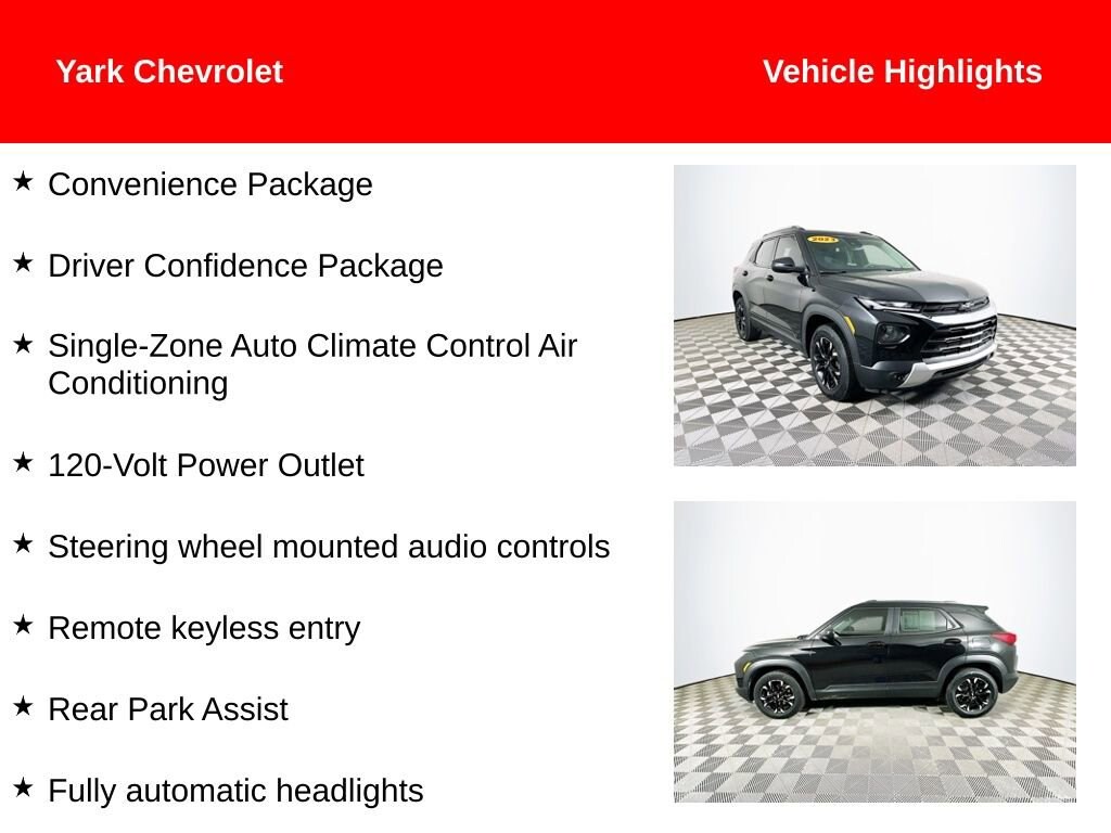Certified. 2023 Mosaic Black Metallic Chevrolet TrailBlazer LT 1.3L Ecotec Turbo DOHC SIDI w/VVT 1 Type-A & 1 Type-C USB Charging-Only Ports, 120-Volt Power Outlet, 8 Diagonal Color Touchscreen Display, Convenience Package, Driver & Front Passenger Illuminated Vanity Mirrors, Driver Confidence Package, Fully automatic headlights, Inside Rear-View Auto-Dimming Mirror, Lane Change Alert w/Side Blind Zone Alert, Rear Cross Traffic Alert, Rear Park Assist, Remote keyless entry, Single-Zone Auto Climate Control Air Conditioning, Steering wheel mounted audio controls, Wireless Apple CarPlay/Android Auto.