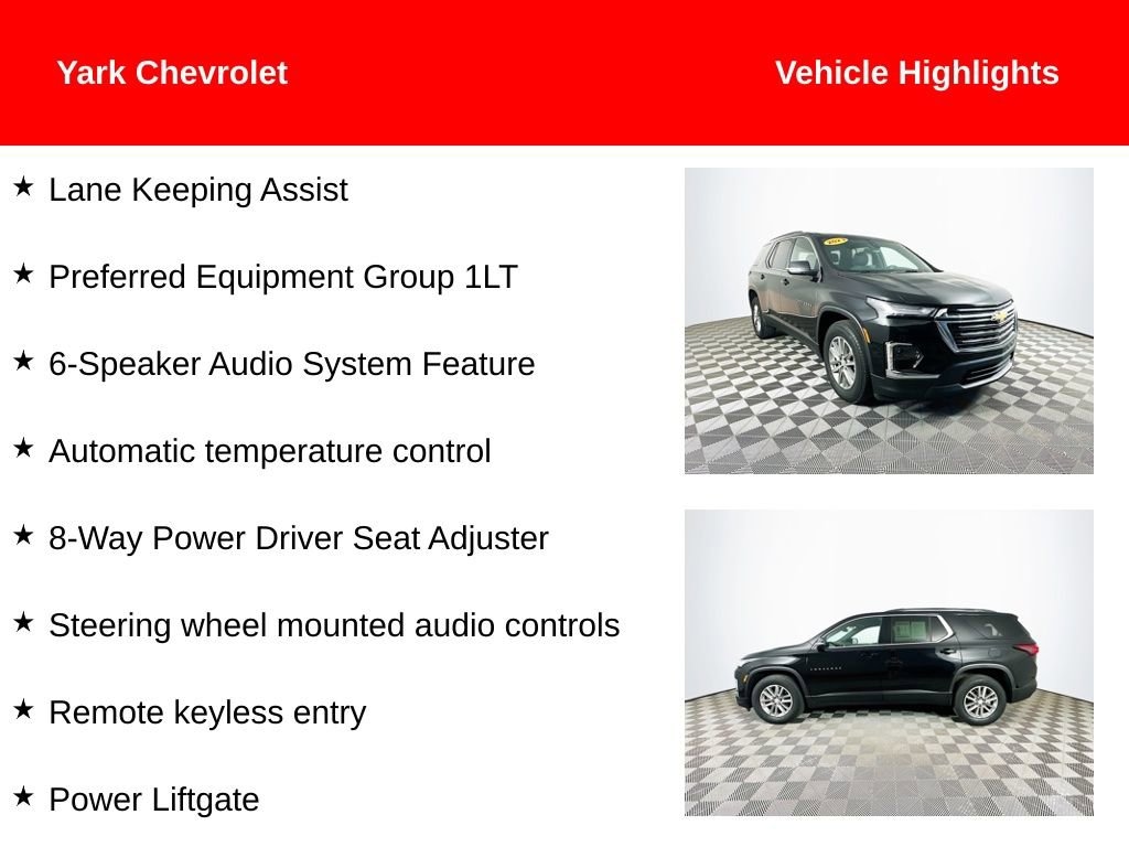 Certified. 2023 Mosaic Black Metallic Chevrolet Traverse LT 3.6L V6 SIDI VVT Lane Keeping Assist, 6-Speaker Audio System Feature, 8-Way Power Driver Seat Adjuster, Apple CarPlay/Android Auto, Automatic temperature control, Exterior Parking Camera Rear, Heated Front Seats, Power Liftgate, Preferred Equipment Group 1LT, Remote keyless entry, Steering wheel mounted audio controls, Wheels: 18 Bright Silver-Painted Aluminum.