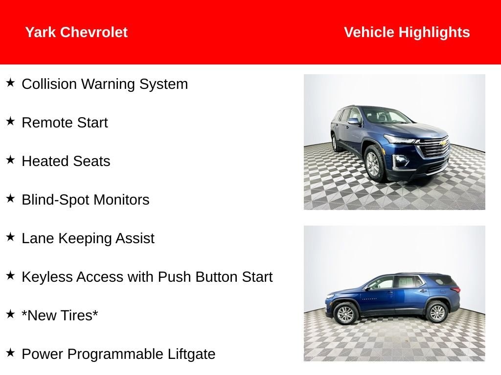 Certified. 2023 Northsky Blue Metallic Chevrolet Traverse LT 3.6L V6 SIDI VVT Collision Warning System, Remote Start, Heated Seats, Blind-Spot Monitors, Lane Keeping Assist, Keyless Access with Push Button Start, *New Tires*, Power Programmable Liftgate, Apple CarPlay/Android Auto, Automatic temperature control, Convenience & Driver Confidence Package, Exterior Parking Camera Rear, Fully automatic headlights, Heated Front Seats, Hitch Guidance w/Hitch View, Preferred Equipment Group 1LT, Premium Cloth Seat Trim, Rear Power Liftgate, Remote keyless entry, Remote Start, Trailering Assist Guidelines, Trailering Equipment, Wheels: 18 Bright Silver-Painted Aluminum.Priced below KBB Fair Purchase Price! Clean CARFAX. CARFAX One-Owner. 18/27 City/Highway MPGCertification Program Details: This vehicle is part of GMâs CarBravo® program meaning you get certified inspection and reconditioning, a standard GM-backed limited warranty, roadside assistance, and access to the nationwide GM service network. Choose with confidence. Ask us about full CarBravo benefits. ? Comprehensive Multi-Point Inspection & Reconditioning Every CarBravo vehicle meets GM standards for quality and reliability. ? GM-Backed Limited Warranty Includes a 6-month/6,000-mile bumper-to-bumper limited warranty (or 30-day/1,000-mile for BravoBudget vehicles). ? Roadside Assistance & Courtesy Transportation Coverage during the warranty period for added confidence. ? Vehicle Exchange Program If itâs not the right fit, exchange it within 10 days or 500 miles. ? Transparent Vehicle History Every CarBravo vehicle includes a free vehicle history report and clear, upfront pricing. ? Nationwide GM Service Network Access professional service and warranty support at thousands of GM dealerships. ? Complimentary Trials Eligible vehicles include a 1-month OnStar® trial and 3-month SiriusXM® subscription. Buy with confidence this CarBravo® vehicle from Yark Automotive Group includes a GM-backed limited warranty, multi-point inspection, roadside assistance, and vehicle exchange program. ? Certified quality. ? Transparent pricing. ? Nationwide GM service support. CarBravo by Yark Certified. Backed by GM. Driven by You.Shop Smarter with Yark Automotive! Yark makes car buying easy with Live Market Pricing updated hourly from over 20,000 sites to ensure you get a real-time, fair market price on every pre-owned vehicle. No games, no inflated prices just transparent, competitive value from a dealership trusted for 40+ years. With 12 brands and 8 convenient locations across NW Ohio & SE Michigan, Yark offers the largest new and used inventory in the region making it easy to find exactly what youâre looking for! Buy with confidence from the regionâs #1 volume new & used automotive group for 28+ years!