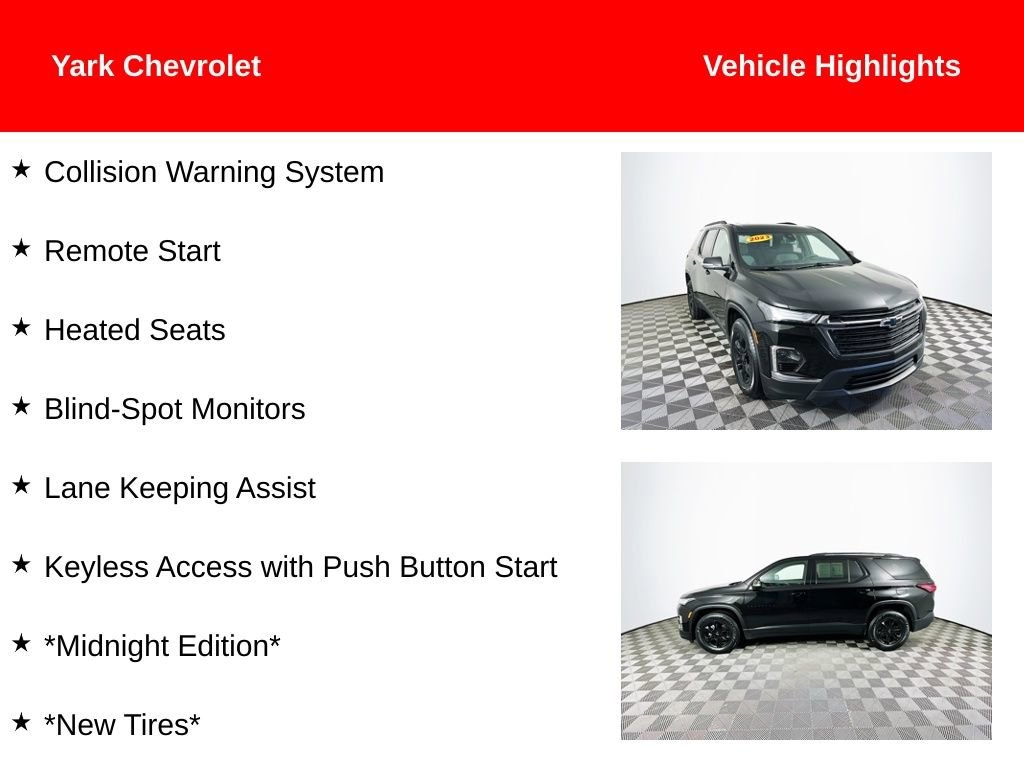 Certified. Recent Arrival! 2023 Mosaic Black Metallic Chevrolet Traverse LT 3.6L V6 SIDI VVT Collision Warning System, Remote Start, Heated Seats, Blind-Spot Monitors, Lane Keeping Assist, Keyless Access with Push Button Start, *Midnight Edition*, *New Tires*, Power Programmable Liftgate, Apple CarPlay/Android Auto, Automatic temperature control, Black Roof Rails, Convenience & Driver Confidence Package, Exterior Parking Camera Rear, Fully automatic headlights, Heated Front Seats, Midnight/Sport Edition, Preferred Equipment Group 1LT, Premium Cloth Seat Trim, Radio: Chevrolet Infotainment 3 Plus System, Rear Power Liftgate, Remote keyless entry, Remote Start, Wheels: 18 Gloss Black Painted Aluminum.Priced below KBB Fair Purchase Price! Clean CARFAX. CARFAX One-Owner. Odometer is 7662 miles below market average! 18/27 City/Highway MPGCertification Program Details: This vehicle is part of GMâs CarBravo® program meaning you get certified inspection and reconditioning, a standard GM-backed limited warranty, roadside assistance, and access to the nationwide GM service network. Choose with confidence. Ask us about full CarBravo benefits. ? Comprehensive Multi-Point Inspection & Reconditioning Every CarBravo vehicle meets GM standards for quality and reliability. ? GM-Backed Limited Warranty Includes a 6-month/6,000-mile bumper-to-bumper limited warranty (or 30-day/1,000-mile for BravoBudget vehicles). ? Roadside Assistance & Courtesy Transportation Coverage during the warranty period for added confidence. ? Vehicle Exchange Program If itâs not the right fit, exchange it within 10 days or 500 miles. ? Transparent Vehicle History Every CarBravo vehicle includes a free vehicle history report and clear, upfront pricing. ? Nationwide GM Service Network Access professional service and warranty support at thousands of GM dealerships. ? Complimentary Trials Eligible vehicles include a 1-month OnStar® trial and 3-month SiriusXM® subscription. Buy with confidence this CarBravo® vehicle from Yark Automotive Group includes a GM-backed limited warranty, multi-point inspection, roadside assistance, and vehicle exchange program. ? Certified quality. ? Transparent pricing. ? Nationwide GM service support. CarBravo by Yark Certified. Backed by GM. Driven by You.Shop Smarter with Yark Automotive! Yark makes car buying easy with Live Market Pricing updated hourly from over 20,000 sites to ensure you get a real-time, fair market price on every pre-owned vehicle. No games, no inflated prices just transparent, competitive value from a dealership trusted for 40+ years. With 12 brands and 8 convenient locations across NW Ohio & SE Michigan, Yark offers the largest new and used inventory in the region making it easy to find exactly what youâre looking for! Buy with confidence from the regionâs #1 volume new & used automotive group for 28+ years!
