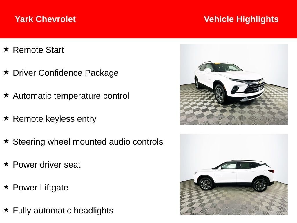 Certified. 2024 Summit White Chevrolet Blazer LT 2.0L Turbocharged Remote Start, Apple CarPlay/Android Auto, Automatic temperature control, Driver Confidence Package, Fully automatic headlights, Heated Front Seats, Lane Change Alert w/Side Blind Zone Alert, Perforated Leather-Appointed Seat Trim, Power driver seat, Power Liftgate, Rear Cross Traffic Alert, Rear Park Assist w/Audible Warning, Remote keyless entry, Steering wheel mounted audio controls, Wheels: 18 Grazen Metallic Aluminum.