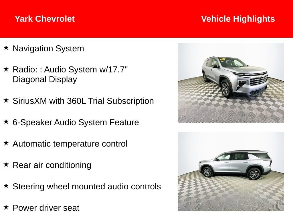 Certified. Recent Arrival! 2025 Sterling Gray Metallic Chevrolet Traverse LT 2.5L DOHC 6-Speaker Audio System Feature, Apple CarPlay/Android Auto, Automatic temperature control, Fully automatic headlights, Heated front seats, Heated steering wheel, Navigation System, Power driver seat, Power Liftgate, Radio: : Audio System w/17.7 Diagonal Display, Rear air conditioning, Remote keyless entry, SiriusXM with 360L Trial Subscription, Steering wheel mounted audio controls.