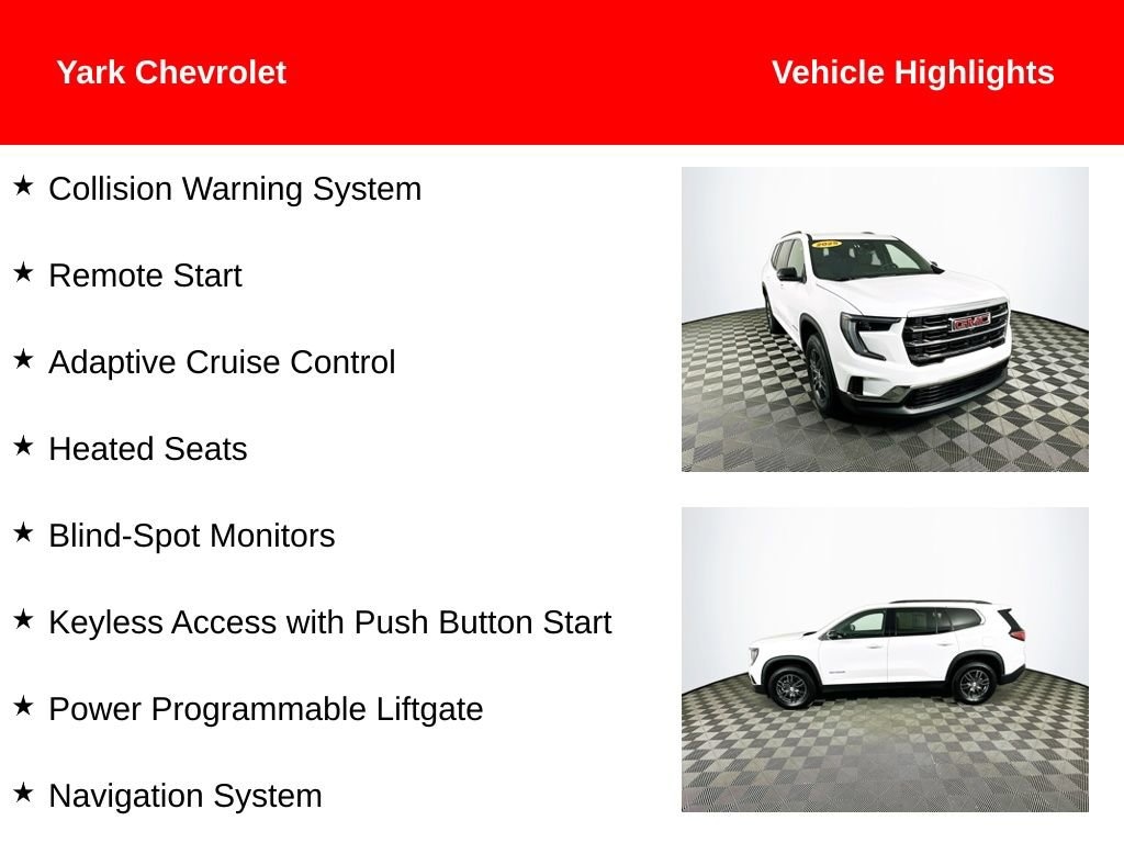 Certified. 2025 Summit White GMC Acadia Elevation 2.5L DOHC Collision Warning System, Remote Start, Adaptive Cruise Control, Heated Seats, Blind-Spot Monitors, Keyless Access with Push Button Start, Power Programmable Liftgate, AWD, 8-Passenger Seating (2-3-3 Seating Configuration), 8-Way Power Driver Seat Adjuster, Alloy wheels, Apple CarPlay/Android Auto, Automatic temperature control, Bose Premium 12-Speaker System with Sub-Woofer, Exterior Parking Camera Rear, Heated front seats, Heated steering wheel, Navigation System, Power Liftgate, Preferred Equipment Group 4SD, Remote keyless entry.Clean CARFAX. CARFAX One-Owner.Certification Program Details: This vehicle is part of GMâs CarBravo® program meaning you get certified inspection and reconditioning, a standard GM-backed limited warranty, roadside assistance, and access to the nationwide GM service network. Choose with confidence. Ask us about full CarBravo benefits. ? Comprehensive Multi-Point Inspection & Reconditioning Every CarBravo vehicle meets GM standards for quality and reliability. ? GM-Backed Limited Warranty Includes a 12-month/12,000-mile bumper-to-bumper limited warranty (or 30-day/1,000-mile for BravoBudget vehicles). ? Roadside Assistance & Courtesy Transportation Coverage during the warranty period for added confidence. ? Vehicle Exchange Program If itâs not the right fit, exchange it within 10 days or 500 miles. ? Transparent Vehicle History Every CarBravo vehicle includes a free vehicle history report and clear, upfront pricing. ? Nationwide GM Service Network Access professional service and warranty support at thousands of GM dealerships. ? Complimentary Trials Eligible vehicles include a 1-month OnStar® trial and 3-month SiriusXM® subscription. Buy with confidence this CarBravo® vehicle from Yark Automotive Group includes a GM-backed limited warranty, multi-point inspection, roadside assistance, and vehicle exchange program. ? Certified quality. ? Transparent pricing. ? Nationwide GM service support. CarBravo by Yark Certified. Backed by GM. Driven by You.Shop Smarter with Yark Automotive! Yark makes car buying easy with Live Market Pricing updated hourly from over 20,000 sites to ensure you get a real-time, fair market price on every pre-owned vehicle. No games, no inflated prices just transparent, competitive value from a dealership trusted for 40+ years. With 12 brands and 8 convenient locations across NW Ohio & SE Michigan, Yark offers the largest new and used inventory in the region making it easy to find exactly what youâre looking for! Buy with confidence from the regionâs #1 volume new & used automotive group for 28+ years!