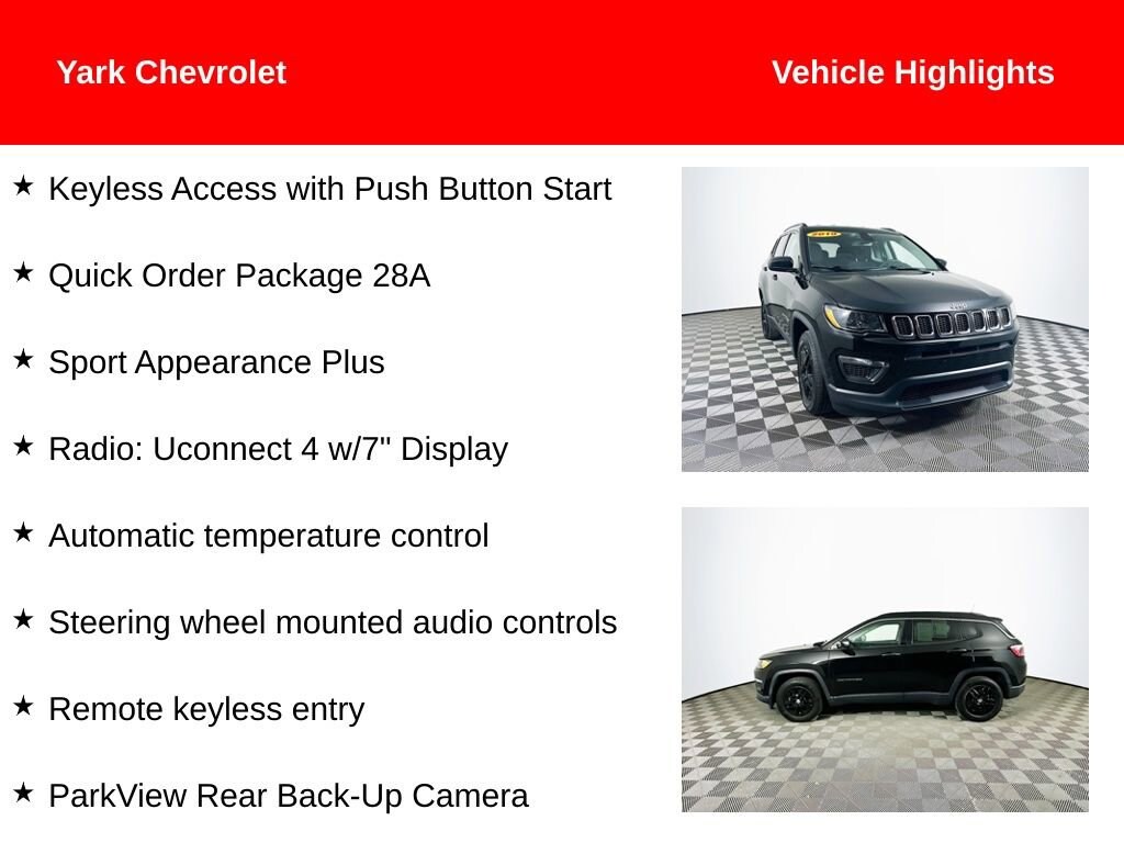 Certified. Recent Arrival! 2019 Diamond Black Crystal Pearlcoat Jeep Compass Sport 2.4L I4 Keyless Access with Push Button Start, Automatic temperature control, Deep Tint Sunscreen Glass, ParkView Rear Back-Up Camera, Quick Order Package 28A, Radio: Uconnect 4 w/7 Display, Remote keyless entry, Sport Appearance Plus, Steering wheel mounted audio controls, Wheels: 16 x 6.5 Silver Painted Aluminum.Priced below KBB Fair Purchase Price! Clean CARFAX. Odometer is 37664 miles below market average! 22/31 City/Highway MPGCertification Program Details: This vehicle is part of GMâs CarBravo® program meaning you get certified inspection and reconditioning, a standard GM-backed limited warranty, roadside assistance, and access to the nationwide GM service network. Choose with confidence. Ask us about full CarBravo benefits. ? Comprehensive Multi-Point Inspection & Reconditioning Every CarBravo vehicle meets GM standards for quality and reliability. ? GM-Backed Limited Warranty Includes a 6-month/6,000-mile bumper-to-bumper limited warranty (or 30-day/1,000-mile for BravoBudget vehicles). ? Roadside Assistance & Courtesy Transportation Coverage during the warranty period for added confidence. ? Vehicle Exchange Program If itâs not the right fit, exchange it within 10 days or 500 miles. ? Transparent Vehicle History Every CarBravo vehicle includes a free vehicle history report and clear, upfront pricing. ? Nationwide GM Service Network Access professional service and warranty support at thousands of GM dealerships. ? Complimentary Trials Eligible vehicles include a 1-month OnStar® trial and 3-month SiriusXM® subscription. Buy with confidence this CarBravo® vehicle from Yark Automotive Group includes a GM-backed limited warranty, multi-point inspection, roadside assistance, and vehicle exchange program. ? Certified quality. ? Transparent pricing. ? Nationwide GM service support. CarBravo by Yark Certified. Backed by GM. Driven by You.Shop Smarter with Yark Automotive! Yark makes car buying easy with Live Market Pricing updated hourly from over 20,000 sites to ensure you get a real-time, fair market price on every pre-owned vehicle. No games, no inflated prices just transparent, competitive value from a dealership trusted for 40+ years. With 12 brands and 8 convenient locations across NW Ohio & SE Michigan, Yark offers the largest new and used inventory in the region making it easy to find exactly what youâre looking for! Buy with confidence from the regionâs #1 volume new & used automotive group for 28+ years!