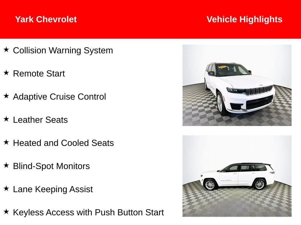 Certified. 2021 Bright White Clearcoat Jeep Grand Cherokee L Summit HEMI 5.7L V8 Multi Displacement VVT Collision Warning System, Remote Start, Adaptive Cruise Control, Leather Seats, Heated and Cooled Seats, Blind-Spot Monitors, Lane Keeping Assist, Keyless Access with Push Button Start, Sunroof / Moonroof, *New Tires*, Memory Seat Package, Power Programmable Liftgate, 4WD, 2nd Row Manual Window Shades, Apple CarPlay/Android Auto, Audio memory, Automatic temperature control, Heated front seats, Heated rear seats, Heated steering wheel, Leather steering wheel, Luxury Tech Group V, Memory seat, Nappa Leather Seats, Navigation System, Power Liftgate, Power moonroof: CommandView, Quick Order Package 25S, Radio: Uconnect 5 Nav w/10.1 Display, Reclining 3rd row seat, Remote keyless entry, Steering wheel memory, Two Tone Paint Group, Ventilated front seats, Wheels: 20 x 8.5 Fully Polished Aluminum, Wireless Charging Pad.