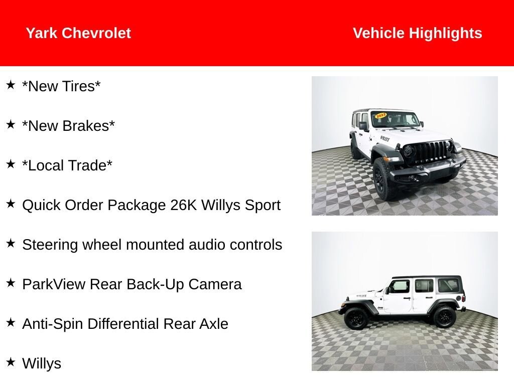 Certified. 2022 Bright White Clearcoat Jeep Wrangler Unlimited Willys 3.0L V6 Turbodiesel *New Tires*, *New Brakes*, *Local Trade*, 4WD, Anti-Spin Differential Rear Axle, Apple CarPlay/Android Auto, Black 3-Piece Hard Top, Black Grille, Black Trail Rated Badge, Deep Tint Sunscreen Windows, Freedom Panel Storage Bag, Matte Black Jeep Badge, Mold In Color Bumper w/Gloss Black, ParkView Rear Back-Up Camera, Quick Order Package 26K Willys Sport, Rear Window Wiper/Washer, Steering wheel mounted audio controls, Wheels: 17 x 7.5 Moab Black Aluminum, Willys, Willys Hood Decal.