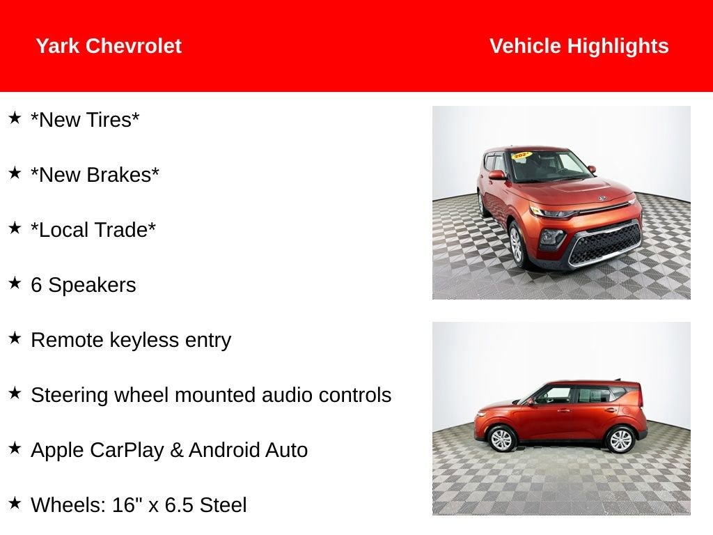 Certified. Recent Arrival! 2021 Mars Orange Kia Soul LX 2.0L I4 MPI DOHC 16V LEV3-SULEV30 147hp *New Tires*, *New Brakes*, *Local Trade*, 6 Speakers, Apple CarPlay & Android Auto, Remote keyless entry, Steering wheel mounted audio controls, Wheels: 16 x 6.5 Steel.Priced below KBB Fair Purchase Price! CARFAX One-Owner. Odometer is 41940 miles below market average! 29/35 City/Highway MPGCertification Program Details: This vehicle is part of GMâs CarBravo® program meaning you get certified inspection and reconditioning, a standard GM-backed limited warranty, roadside assistance, and access to the nationwide GM service network. Choose with confidence. Ask us about full CarBravo benefits. ? Comprehensive Multi-Point Inspection & Reconditioning Every CarBravo vehicle meets GM standards for quality and reliability. ? GM-Backed Limited Warranty Includes a 12-month/12,000-mile bumper-to-bumper limited warranty (or 30-day/1,000-mile for BravoBudget vehicles). ? Roadside Assistance & Courtesy Transportation Coverage during the warranty period for added confidence. ? Vehicle Exchange Program If itâs not the right fit, exchange it within 10 days or 500 miles. ? Transparent Vehicle History Every CarBravo vehicle includes a free vehicle history report and clear, upfront pricing. ? Nationwide GM Service Network Access professional service and warranty support at thousands of GM dealerships. ? Complimentary Trials Eligible vehicles include a 1-month OnStar® trial and 3-month SiriusXM® subscription. Buy with confidence this CarBravo® vehicle from Yark Automotive Group includes a GM-backed limited warranty, multi-point inspection, roadside assistance, and vehicle exchange program. ? Certified quality. ? Transparent pricing. ? Nationwide GM service support. CarBravo by Yark Certified. Backed by GM. Driven by You.Welcome to Yark Automotive where we make buying a car easy with LIVE MARKET PRICING. Our live market pricing mission is to present the best pricing to all of our customers. Pre-owned live market pricing is achieved by polling over 20,000 pre-owned web sites hourly. This ensures that every one of our customers receives real time market price on every pre-owned vehicle we sell. We do not artificially inflate our pre-owned prices in the hopes of winning a negotiating contest with our customers! We do not play pricing games. After being in business for 35+ years, we realize that live market pricing is, by far, the best approach for our customers.