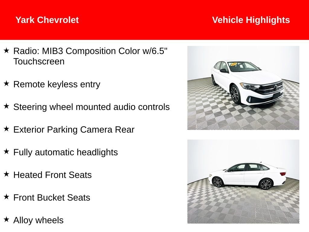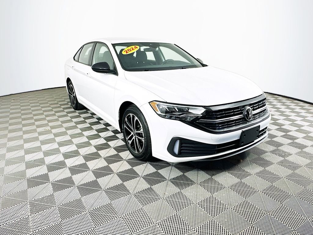 Certified. 2024 Pure White Volkswagen Jetta 1.5T Sport 1.5L I-4 DI DOHC Turbocharged Alloy wheels, Exterior Parking Camera Rear, Front Bucket Seats, Fully automatic headlights, Heated Front Seats, Radio: MIB3 Composition Color w/6.5 Touchscreen, Remote keyless entry, Steering wheel mounted audio controls.