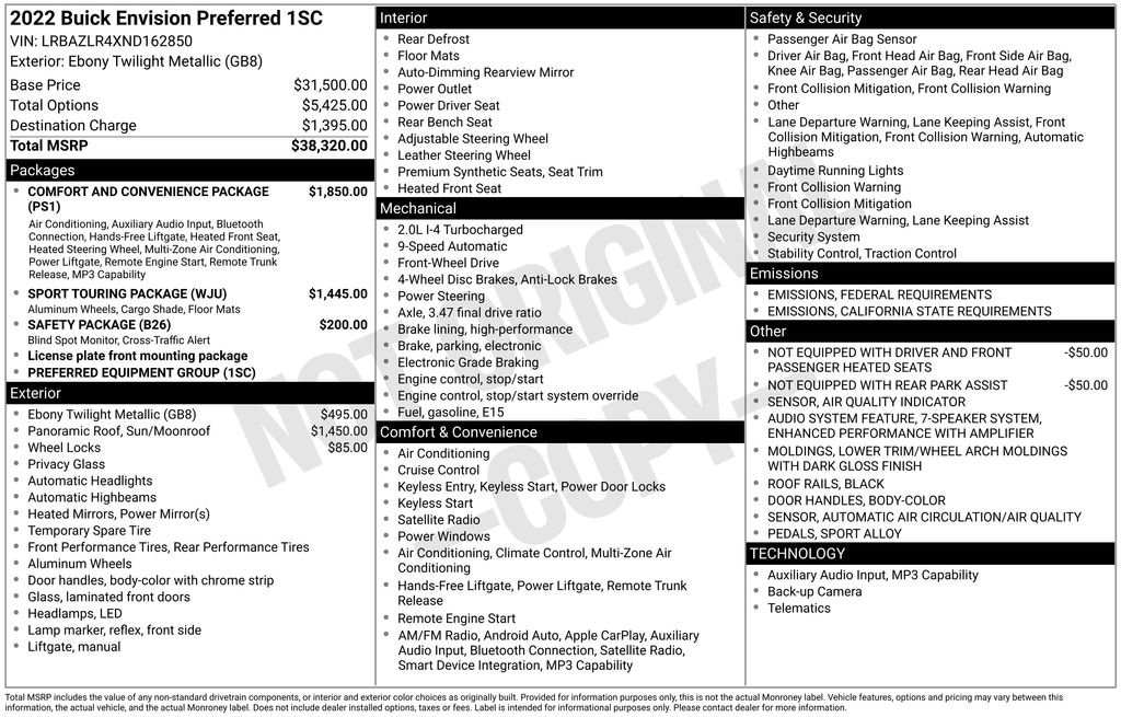 Recent Arrival! 2022 Ebony Twilight Metallic Buick Envision Preferred 2.0L Turbocharged 7-Speaker Audio System Feature w/Amplifier, Air Quality Indicator Sensor, Automatic Air Circulation/Air Quality Sensor, Black Roof Rails, Body-Color Door Handles, Carpeted Front & Rear Floor Mats, Comfort & Convenience Package, Dual-Zone ACC Air Conditioning, Hands Free Power Programmable Liftgate, Heated Front Seats, Heated Steering Wheel, Lane Change Alert w/Side Blind Zone Alert, Lower Trim/Wheel Arch Moldings, Power Panoramic Tilt-Sliding Moonroof, Radio: Buick Infotainment System AM/FM Stereo, Rear Cargo Compartment Cover, Rear Cross Traffic Alert, Remote Vehicle Starter System, Safety Package, Sport Alloy Pedals, Sport Touring Package, Wheels: 20 Aluminum w/Dark Finish.