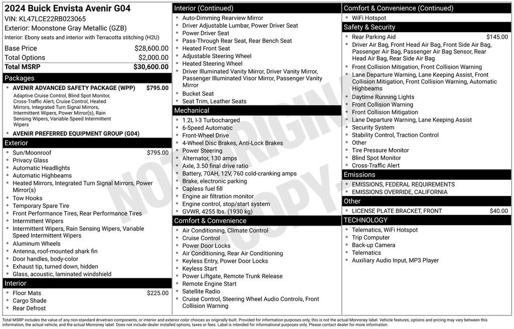 Recent Arrival! 2024 Moonstone Gray Metallic Buick Envista Avenir ECOTEC 1.2L Turbo Adaptive Cruise Control, Automatic temperature control, Avenir Advanced Safety Package, Exterior Parking Camera Rear, Front Intermittent Rainsense Wipers, Fully automatic headlights, Lane Change Alert w/Side Blind Zone Alert, Perforated Leather-Appointed Seat Trim, Power driver seat, Power Liftgate, Power Tilt-Sliding Moonroof w/Manual Sunshade, Power-Adjustable Outside Heated Mirrors, Rear Cross Traffic Alert, Remote keyless entry, Steering wheel mounted audio controls, Wireless Apple CarPlay/Wireless Android Auto.