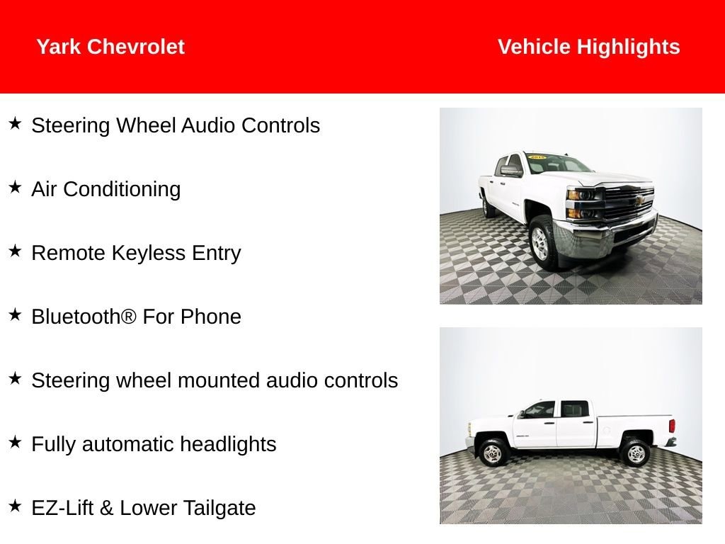 2015 Summit White Chevrolet Silverado 2500HD LT Vortec 6.0L V8 SFI Flex Fuel VVT Air Conditioning, Bluetooth® For Phone, EZ-Lift & Lower Tailgate, Fully automatic headlights, Remote Keyless Entry, Steering Wheel Audio Controls, Steering wheel mounted audio controls.