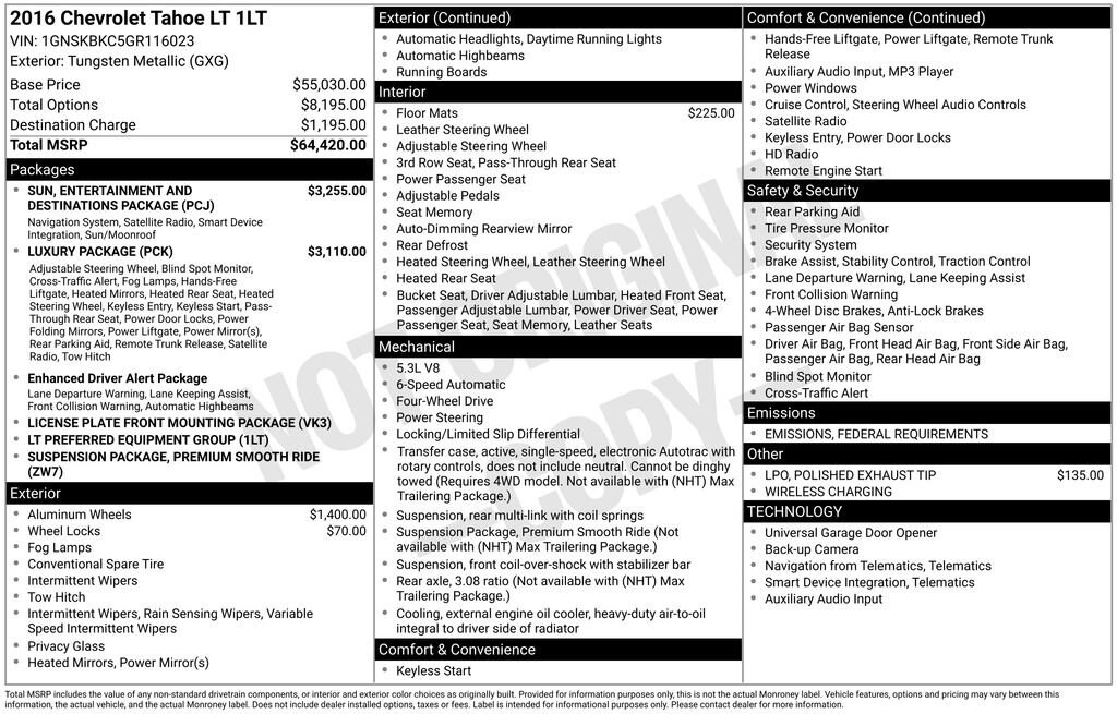 Recent Arrival! 2016 Tungsten Metallic Chevrolet Tahoe LT EcoTec3 5.3L V8 4WD, 2nd Row Pwr Release 60/40 Split Folding Bench Seat, 3rd Row 60/40 Power Fold Split-Bench, Apple CarPlay, Automatic temperature control, Bose Premium 9-Speaker System, Fog Lamps, Front & Rear Parking Assist, Front Heated Reclining Bucket Seats, Fully automatic headlights, Hands Free Power Liftgate, Heated 2nd Row Seats, Heated Leather Wrapped Steering Wheel, Lane Departure Warning System, Luxury Package, Memory Settings, Passive Entry System, Power Liftgate, Power Sunroof, Power Tilt & Telescopic Steering Column w/Memory, Power-Folding Heated Outside Mirrors, Premium Smooth Ride Suspension Package, Push Button Keyless Start, Radio: Chevrolet MyLink w/Navigation/AM/FM Stereo, Rear air conditioning, Rear Cross-Traffic Alert, Rear Seat Blu-Ray/DVD Entertainment System, Side Blind Zone Alert w/Lane Change Alert, Sun, Entertainment & Destinations Package, Wireless Charging.