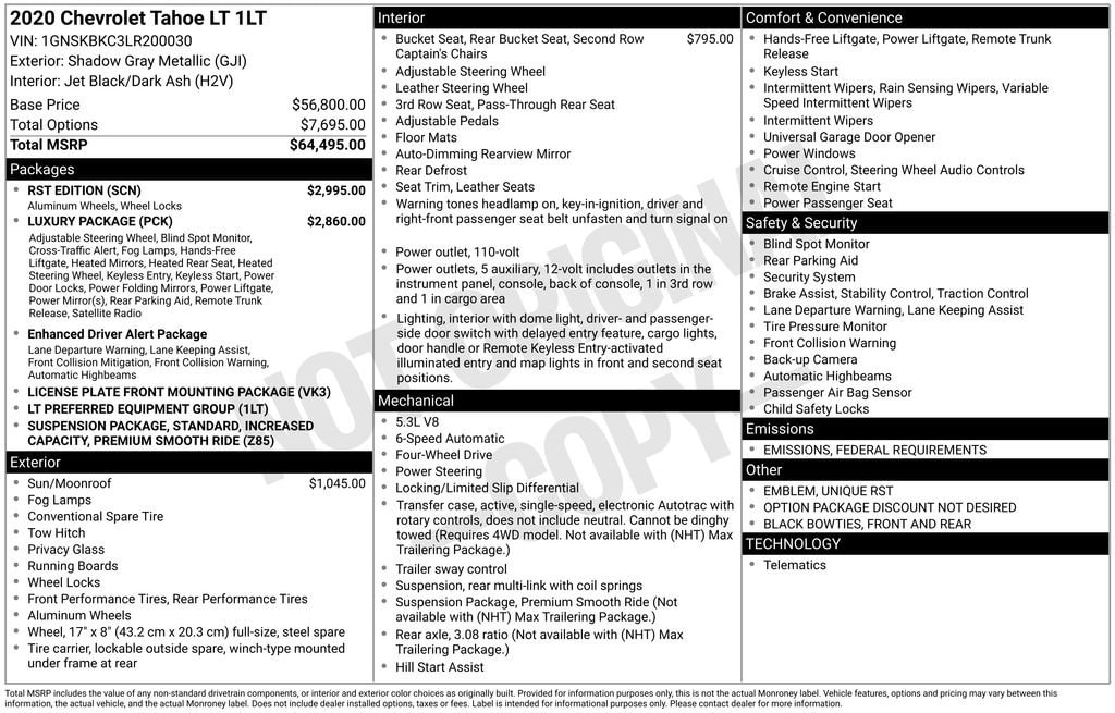 Recent Arrival! 2020 Shadow Gray Metallic Chevrolet Tahoe LT EcoTec3 5.3L V8 4WD, 2nd Row Pwr Release 60/40 Split Folding Bench Seat, 3rd Row 60/40 Power Fold Split-Bench, Apple CarPlay/Android Auto, Automatic Emergency Braking, Automatic temperature control, Black Beltline Moldings, Black Mirror Caps, Black Roof Rails, Body-Color Door Handles & Headlamp Accents, Bose Premium 9-Speaker System, Electronic Cruise Control w/Set & Resume Speed, Enhanced Driver Alert Package (Y86), Fog Lamps, Forward Collision Alert, Front & Rear Black Bowties, Front & Rear Park Assist, Hands Free Power Liftgate, Heated 2nd Row Seats, Heated Leather Wrapped Steering Wheel, IntelliBeam Headlamps, Lane Change Alert w/Side Blind Zone Alert, Lane Keep Assist w/Lane Departure Warning, Luxury Package, Passive Entry System, Power Liftgate, Power Sunroof, Power Tilt & Telescopic Steering Column w/Memory, Power-Folding Heated Outside Mirrors, Premium Smooth Ride Suspension Package, Push Button Keyless Start, Rear air conditioning, Rear Cross Traffic Alert, Remote keyless entry, RST Edition, Set of 4 Wheel Locks (LPO), Standard Suspension Package, Steering wheel mounted audio controls, Unique Gloss Black Sport Grille, Unique RST Emblem, Wheels: 22 x 9 Gloss Black Aluminum.Clean CARFAX. Odometer is 21847 miles below market average!Welcome to Yark Automotive where we make buying a car easy with LIVE MARKET PRICING. Our live market pricing mission is to present the best pricing to all of our customers. Pre-owned live market pricing is achieved by polling over 20,000 pre-owned web sites hourly. This ensures that every one of our customers receives real time market price on every pre-owned vehicle we sell. We do not artificially inflate our pre-owned prices in the hopes of winning a negotiating contest with our customers! We do not play pricing games. After being in business for 35+ years, we realize that live market pricing is, by far, the best approach for our customers.