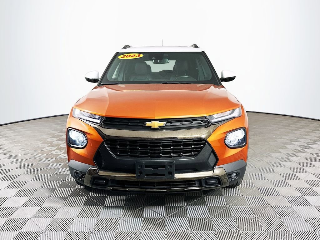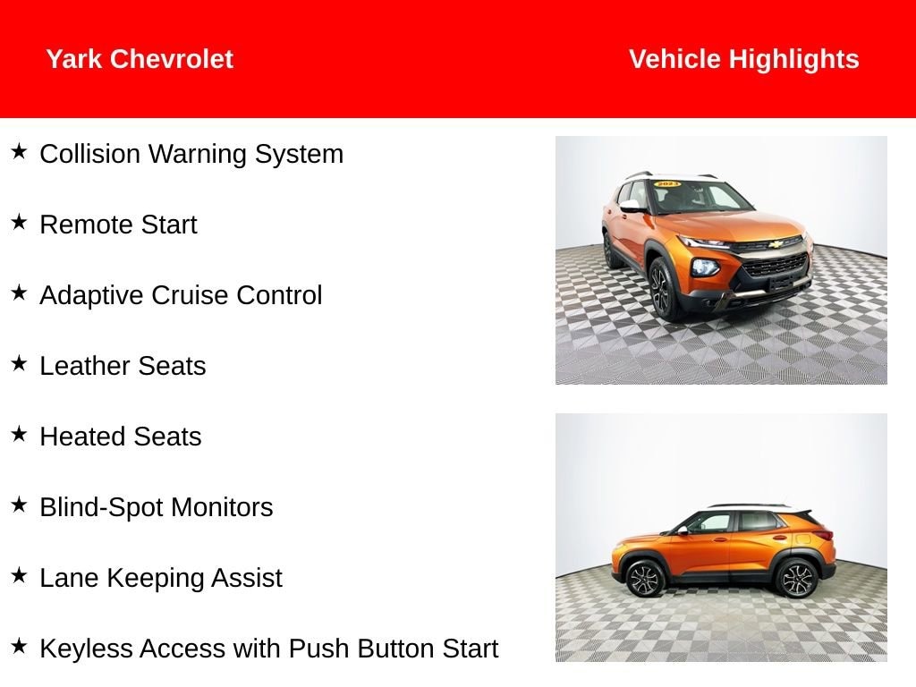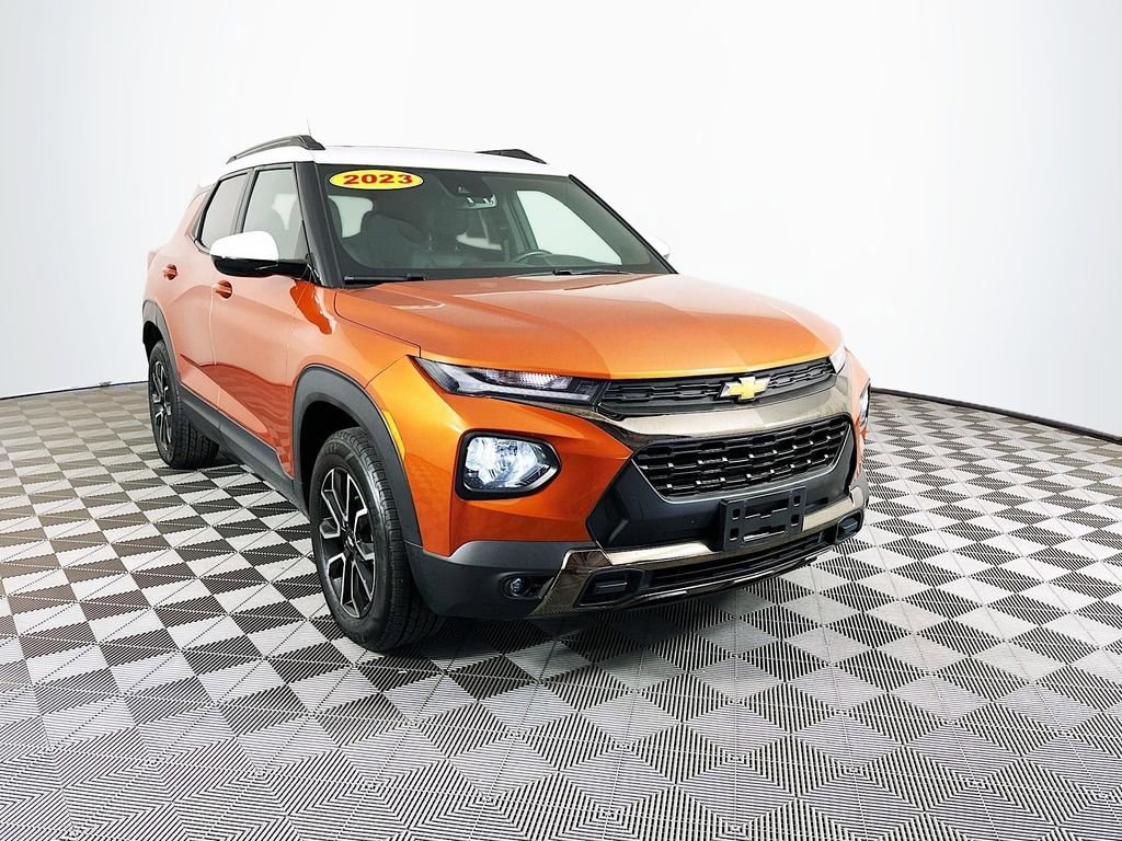 Certified. 2023 Vivid Orange Metallic Chevrolet TrailBlazer ACTIV 1.3L Ecotec Turbo DOHC SIDI w/VVT Collision Warning System, Remote Start, Adaptive Cruise Control, Leather Seats, Heated Seats, Blind-Spot Monitors, Lane Keeping Assist, Keyless Access with Push Button Start, Sunroof / Moonroof, *New Tires*, Bose Premium Audio Package, Power Programmable Liftgate, AWD, 8 Diagonal Color Touchscreen Display, Adaptive Cruise Control, Bose Premium 7-Speaker Audio System Feature, Confidence II Package, Convenience Package, Dual-Pane Panoramic Power Sunroof, Exterior Parking Camera Rear, Hands-Free Power Programmable Liftgate, HD Rear Vision Camera, Heated Front Seats, Heated Steering Wheel, LED Headlamps, Preferred Equipment Group 1SA, Rear Park Assist, Remote keyless entry, Single-Zone Auto Climate Control Air Conditioning, Sun & Liftgate Package, Technology Package, Wheels: 17 High Gloss Black Machined Aluminum, Wireless Apple CarPlay/Android Auto, Wireless Charging.