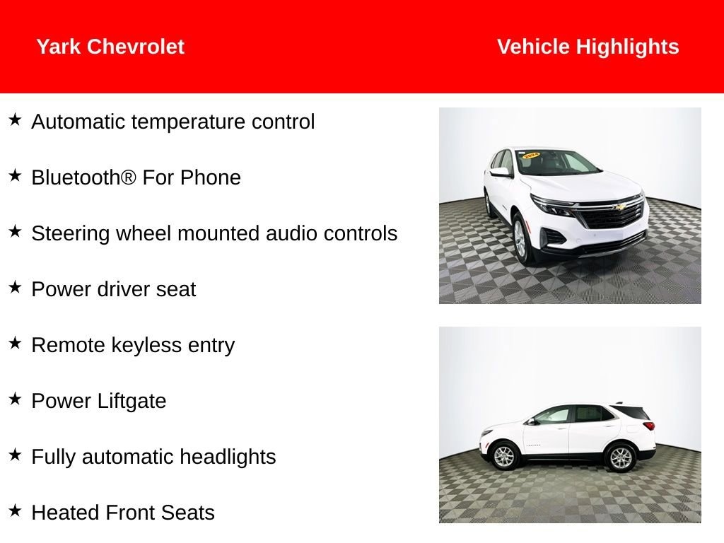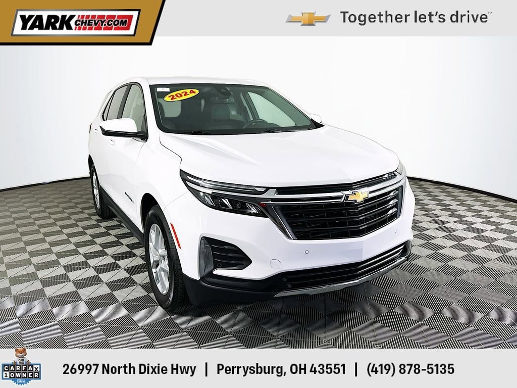 2024 Summit White Chevrolet Equinox LT 1.5L DOHC Automatic temperature control, Bluetooth® For Phone, Fully automatic headlights, Heated Front Seats, Power driver seat, Power Liftgate, Remote keyless entry, Steering wheel mounted audio controls.Clean CARFAX. CARFAX One-Owner. Odometer is 10158 miles below market average! 26/31 City/Highway MPGShop Smarter with Yark Automotive! Yark makes car buying easy with Live Market Pricing updated hourly from over 20,000 sites to ensure you get a real-time, fair market price on every pre-owned vehicle. No games, no inflated prices just transparent, competitive value from a dealership trusted for 40+ years. With 12 brands and 8 convenient locations across NW Ohio & SE Michigan, Yark offers the largest new and used inventory in the region making it easy to find exactly what youâre looking for! Buy with confidence from the regionâs #1 volume new & used automotive group for 28+ years!