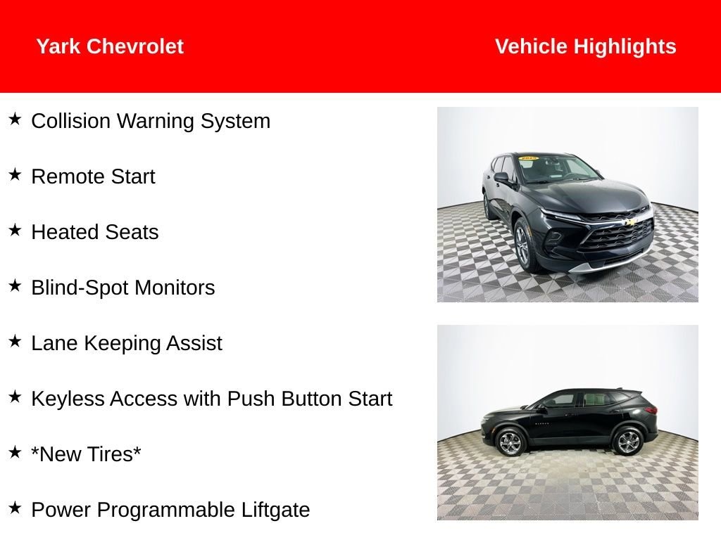 Certified. Recent Arrival! 2025 Black Chevrolet Blazer LT 2.0L Turbocharged Collision Warning System, Remote Start, Heated Seats, Blind-Spot Monitors, Lane Keeping Assist, Keyless Access with Push Button Start, *New Tires*, Power Programmable Liftgate, Automatic temperature control, Driver Confidence Package, Heated front seats, Lane Change Alert with Side Blind Zone Alert, Preferred Equipment Group 2LT, Premium audio system: Chevrolet Infotainment 3 Plus, Rear Cross Traffic Alert, Rear Park Assist with Audible Warning, Remote keyless entry, Wheels: : 18 Grazen Metallic Aluminum.Clean CARFAX. 22/29 City/Highway MPGCertification Program Details: This vehicle is part of GMâs CarBravo® program meaning you get certified inspection and reconditioning, a standard GM-backed limited warranty, roadside assistance, and access to the nationwide GM service network. Choose with confidence. Ask us about full CarBravo benefits. ? Comprehensive Multi-Point Inspection & Reconditioning Every CarBravo vehicle meets GM standards for quality and reliability. ? GM-Backed Limited Warranty Includes a 12-month/12,000-mile bumper-to-bumper limited warranty (or 30-day/1,000-mile for BravoBudget vehicles). ? Roadside Assistance & Courtesy Transportation Coverage during the warranty period for added confidence. ? Vehicle Exchange Program If itâs not the right fit, exchange it within 10 days or 500 miles. ? Transparent Vehicle History Every CarBravo vehicle includes a free vehicle history report and clear, upfront pricing. ? Nationwide GM Service Network Access professional service and warranty support at thousands of GM dealerships. ? Complimentary Trials Eligible vehicles include a 1-month OnStar® trial and 3-month SiriusXM® subscription. Buy with confidence this CarBravo® vehicle from Yark Automotive Group includes a GM-backed limited warranty, multi-point inspection, roadside assistance, and vehicle exchange program. ? Certified quality. ? Transparent pricing. ? Nationwide GM service support. CarBravo by Yark Certified. Backed by GM. Driven by You.Welcome to Yark Automotive where we make buying a car easy with LIVE MARKET PRICING. Our live market pricing mission is to present the best pricing to all of our customers. Pre-owned live market pricing is achieved by polling over 20,000 pre-owned web sites hourly. This ensures that every one of our customers receives real time market price on every pre-owned vehicle we sell. We do not artificially inflate our pre-owned prices in the hopes of winning a negotiating contest with our customers! We do not play pricing games. After being in business for 35+ years, we realize that live market pricing is, by far, the best approach for our customers.