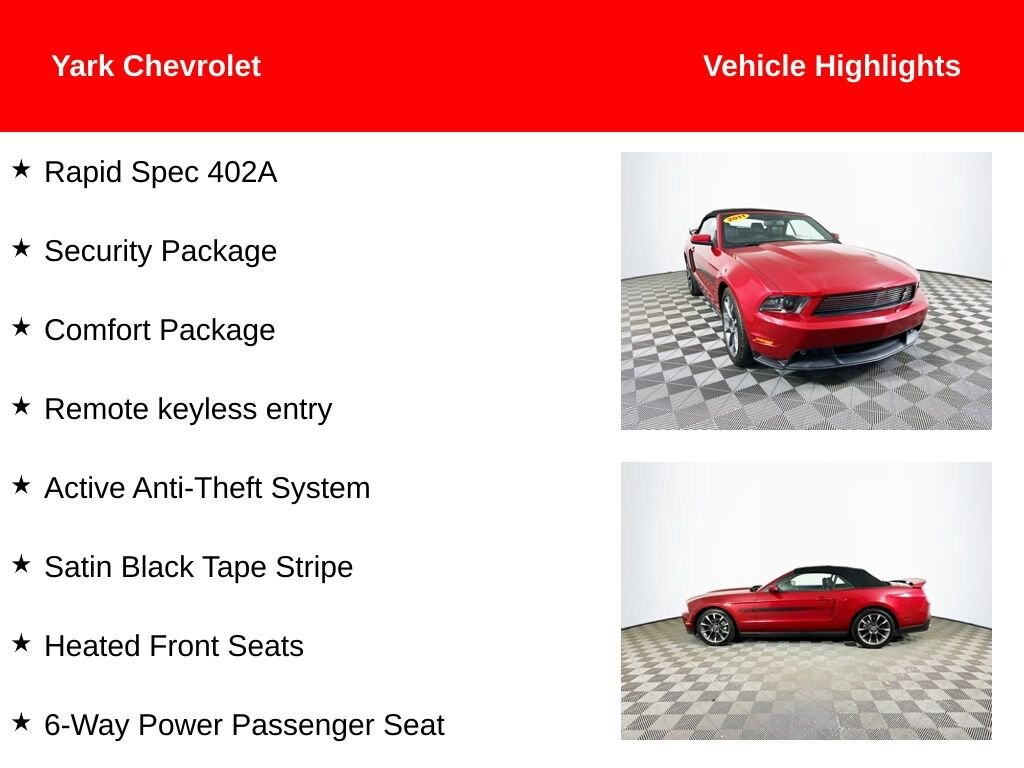 2011 Red Candy Metallic Tinted Clearcoat Ford Mustang GT Premium 5.0L V8 Ti-VCT 32V 6-Way Power Passenger Seat, Active Anti-Theft System, Comfort Package, Heated Front Seats, Rapid Spec 402A, Remote keyless entry, Satin Black Tape Stripe, Security Package, Wheel Locking Kit.Odometer is 29537 miles below market average! 17/26 City/Highway MPGWelcome to Yark Automotive where we make buying a car easy with LIVE MARKET PRICING. Our live market pricing mission is to present the best pricing to all of our customers. Pre-owned live market pricing is achieved by polling over 20,000 pre-owned web sites hourly. This ensures that every one of our customers receives real time market price on every pre-owned vehicle we sell. We do not artificially inflate our pre-owned prices in the hopes of winning a negotiating contest with our customers! We do not play pricing games. After being in business for 35+ years, we realize that live market pricing is, by far, the best approach for our customers.