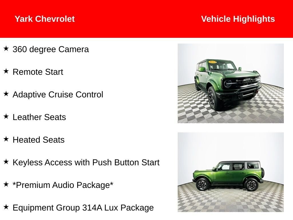 Discover the ultimate blend of capability, technology, and luxury with the 2022 Ford Bronco Outer Banks. Visit our showroom today and experience the thrill of driving this exceptional off-road-ready SUV for yourself.