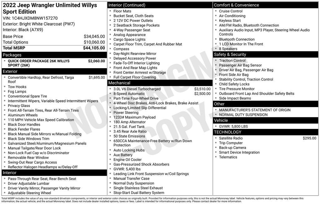 Certified. Recent Arrival! 2022 Bright White Clearcoat Jeep Wrangler Unlimited Willys 3.0L V6 Turbodiesel 4WD, Air Conditioning, Apple CarPlay/Android Auto, Front Bucket Seats, ParkView Rear Back-Up Camera, Steering wheel mounted audio controls, Wheels: 17 x 7.5 Black Steel Styled.