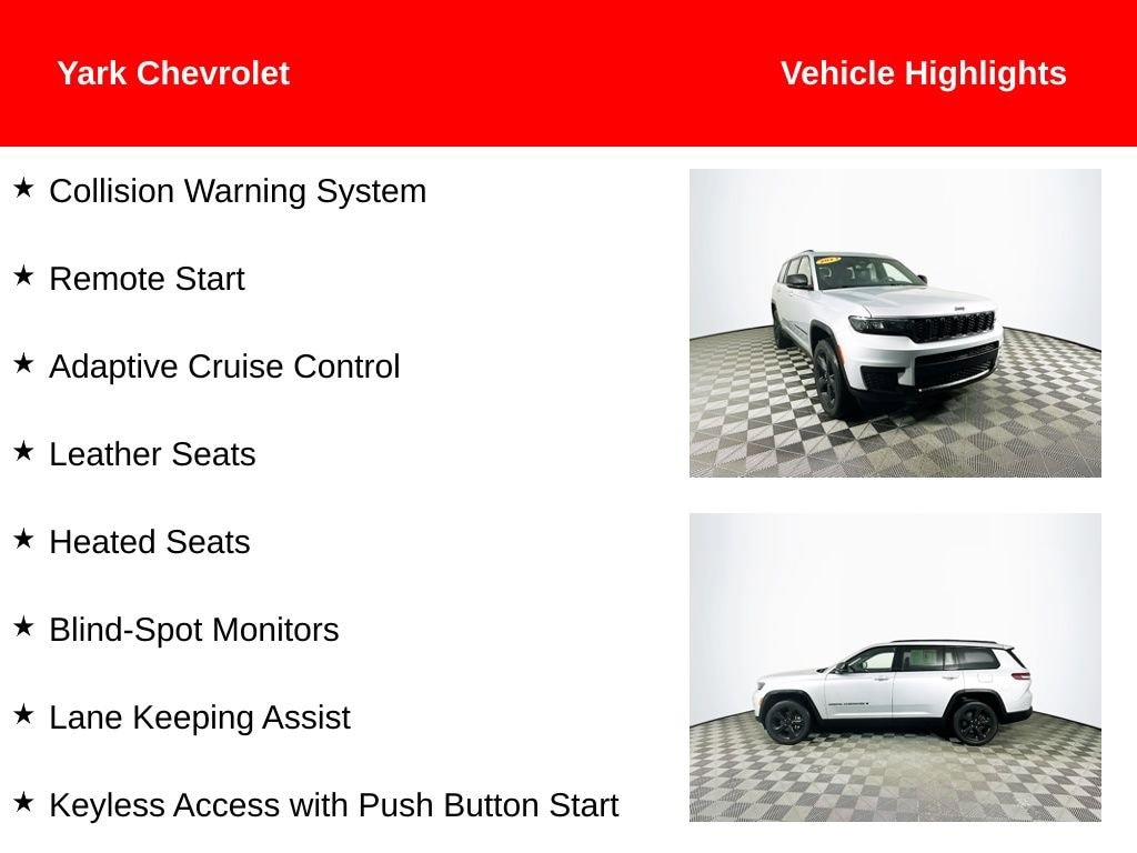 Certified. 2023 Silver Zynith Jeep Grand Cherokee L Altitude 3.6L V6 24V VVT Collision Warning System, Remote Start, Adaptive Cruise Control, Leather Seats, Heated Seats, Blind-Spot Monitors, Lane Keeping Assist, Keyless Access with Push Button Start, Power Programmable Liftgate, 4WD, Altitude Appearance Package, Automatic temperature control, Capri Leatherette/Suede Seats, Heated Front Seats, Heated Steering Wheel, ParkView Rear Back-Up Camera, Power Liftgate, Quick Order Package 22B Altitude, Rain Sensitive Windshield Wipers, Reclining 3rd row seat, Remote keyless entry, Wheels: 20 x 8.5 Gloss Black Painted Aluminum, Wireless Charging Pad.